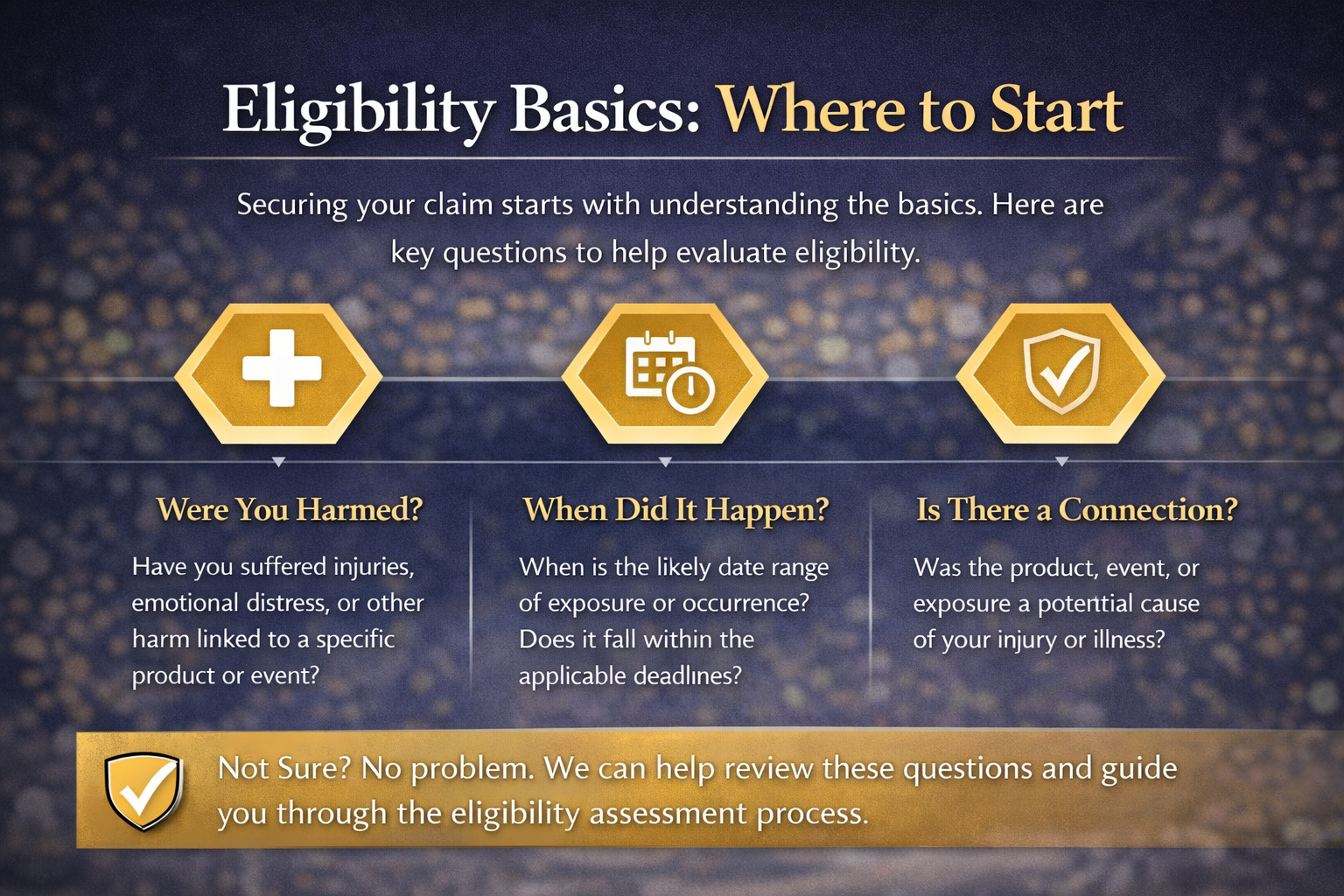 • Identify which case type may apply (Paraquat, Talc, Roundup, Hair Relaxers, AFFF, Depo-Provera, Roblox, etc.)